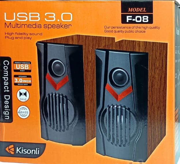 The Kisonli F-08 USB 3.0 Multimedia Speaker combines powerful sound and elegant design. With a 3.0-inch drive unit and dual 3W output, it delivers clear highs and deep bass. Perfect for laptops, PCs, and home entertainment setups. Plug & play simplicity — just connect via USB and enjoy premium sound instantly.